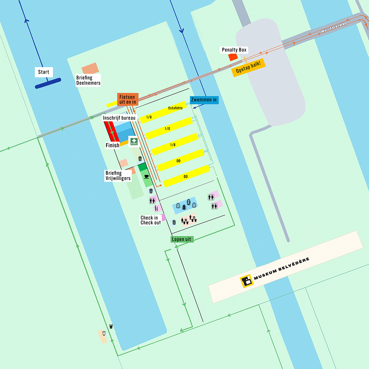 Na het afronden van het zwemparcours zwem je onder de brug door en verlaat je het water. Bij de uitgang staan vrijwilligers die jou waar nodig zullen helpen. Deze hulp levert geen diskwalificatie op.